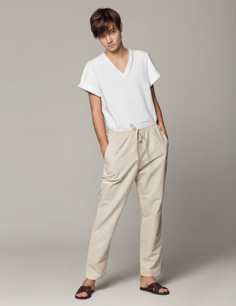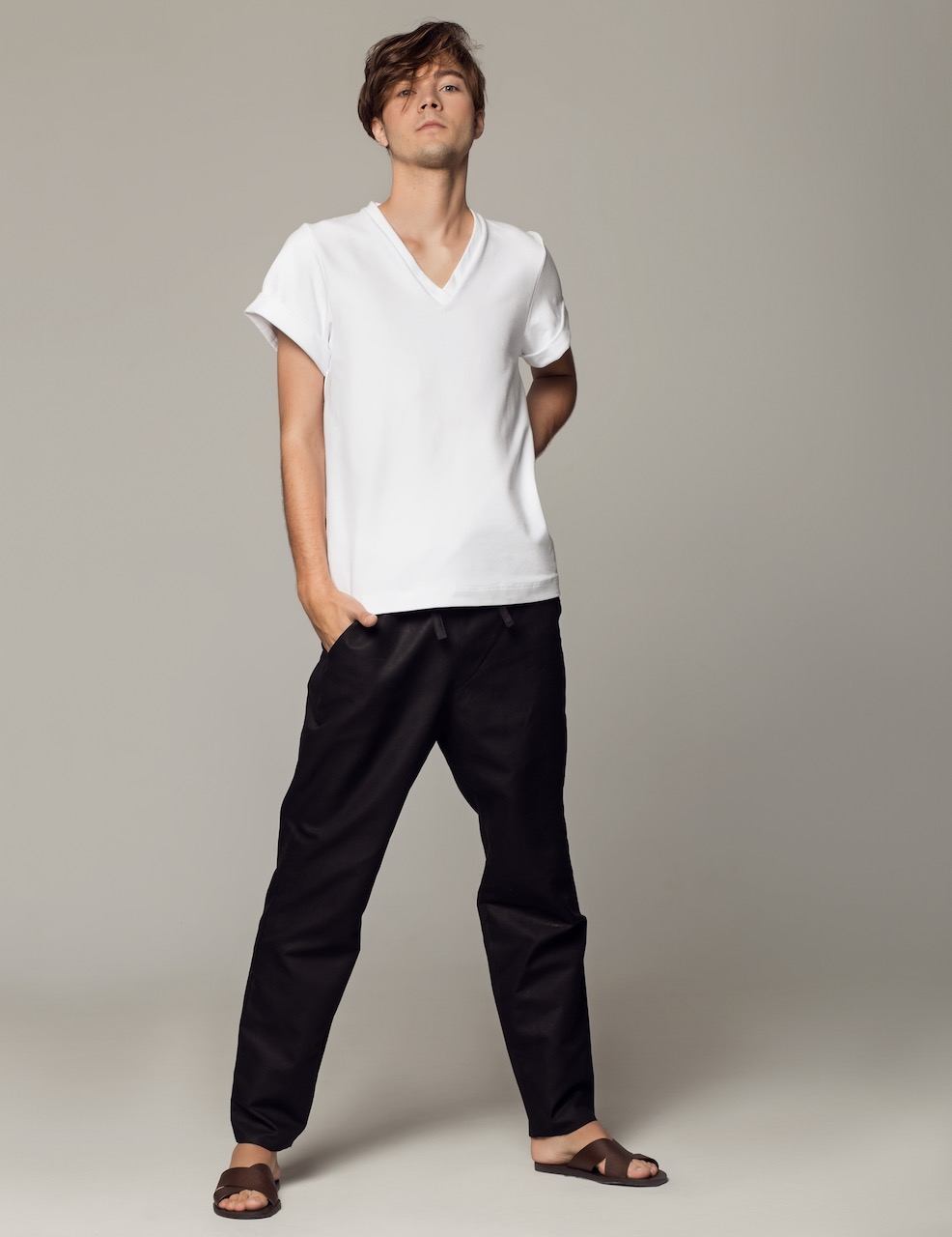 Tradycyjną piżamę postanowiłyśmy przełamać nowoczesną formą. Mężczyźni uwielbiają luźne T-shirty, dlaczego więc nie połączyć ich z wygodnymi lnianymi spodniami? Dzięki temu powstała nasza propozycja z białą i czarną koszulką. Przyjemna bawełna sprawdzi się nie tylko nocą, a klasyczny T-shirt pewnie wielu z mężczyzn wykorzysta także na co dzień.